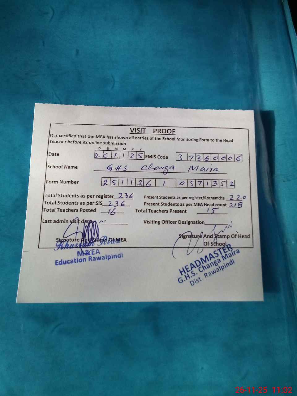 | Attendance Register | Head Teacher | MEA with School | Visit Proof |