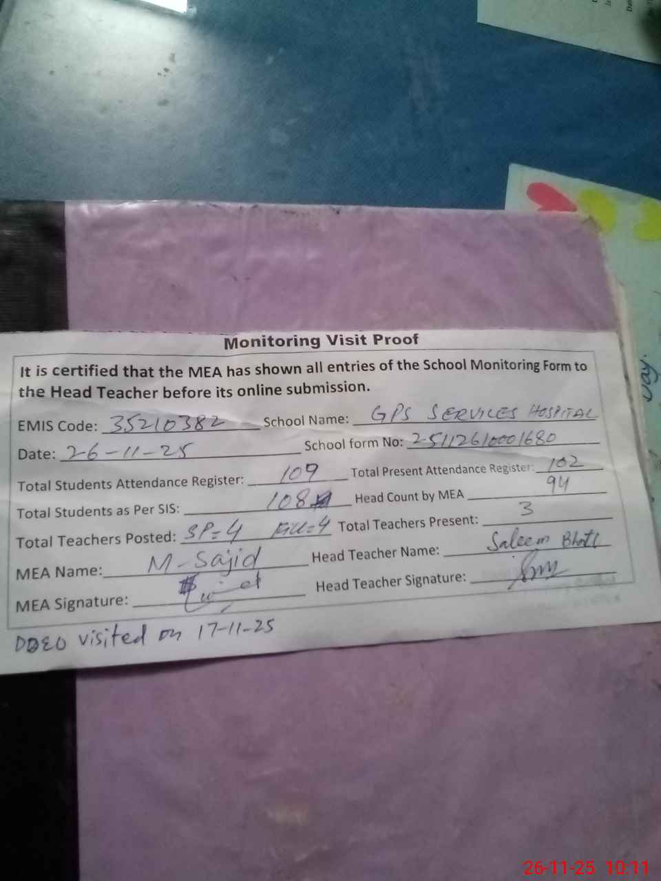 | Remarks (Use Separate Page if Required): During Random attendance of Kachi class it is noticed that most of the students name of random list are not found in attendance register of this class as only 3 students out of 12 of this list are marked present DDEO visited this school on 17 Nov 2025 Total sanctioned teacher posts are 4 8 students difference found in Roznamcha and head count present students percentage is 87 percent 35210382 | |||||
