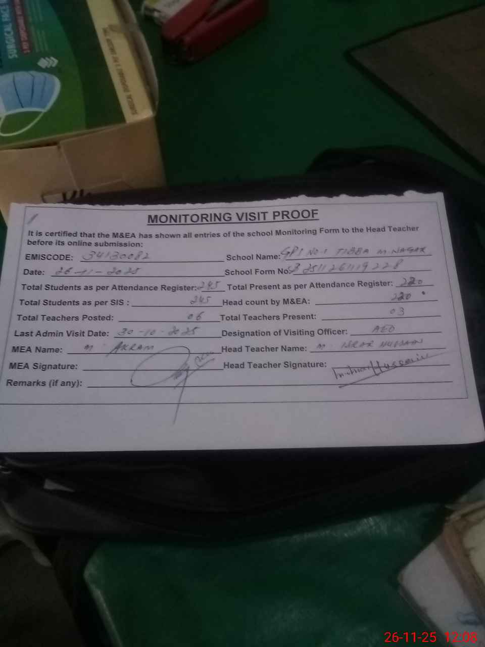 | Attendance Register | Head Teacher | MEA with School | Visit Proof |