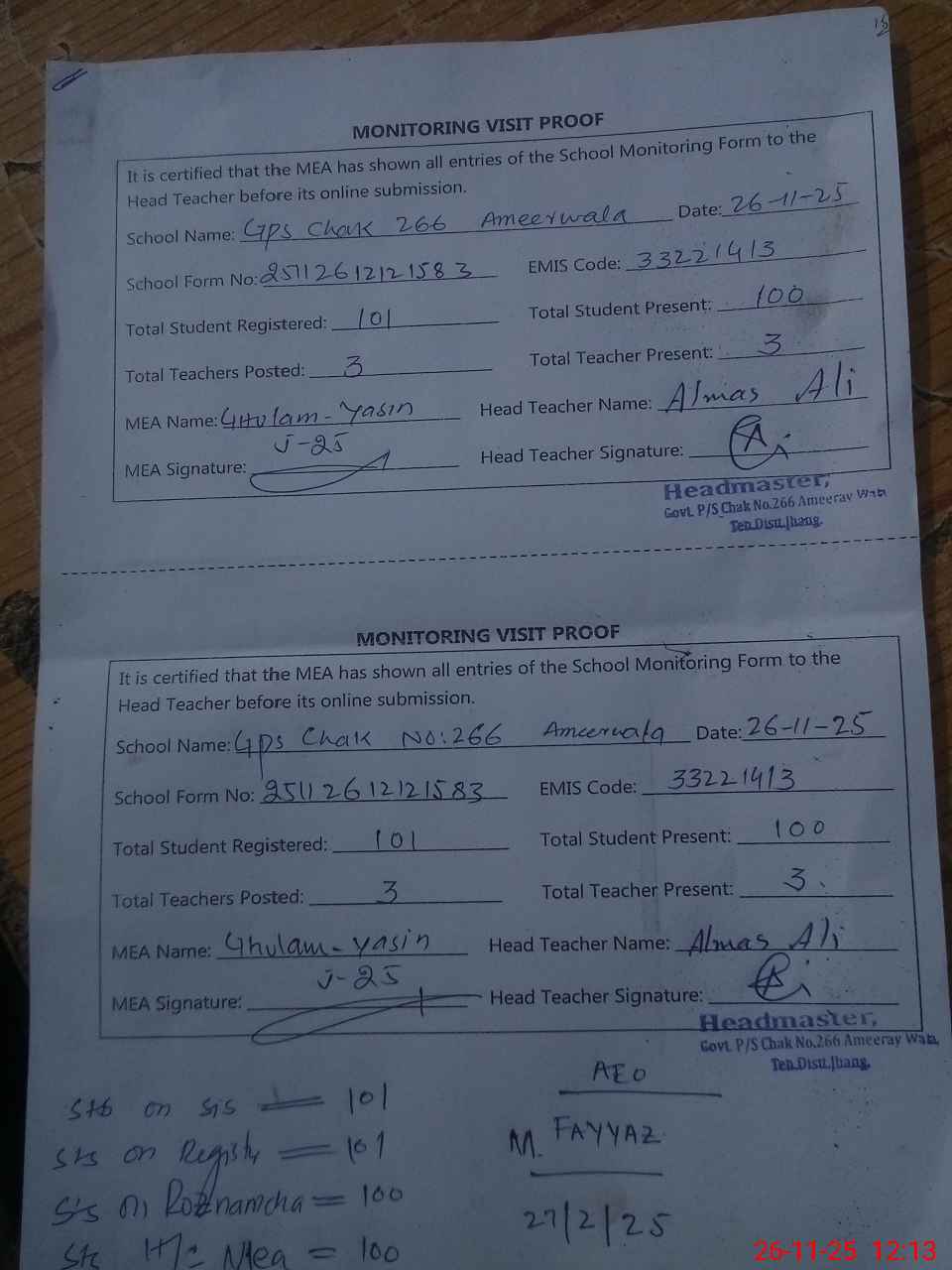 | Attendance Register | Head Teacher | MEA with School | Visit Proof |