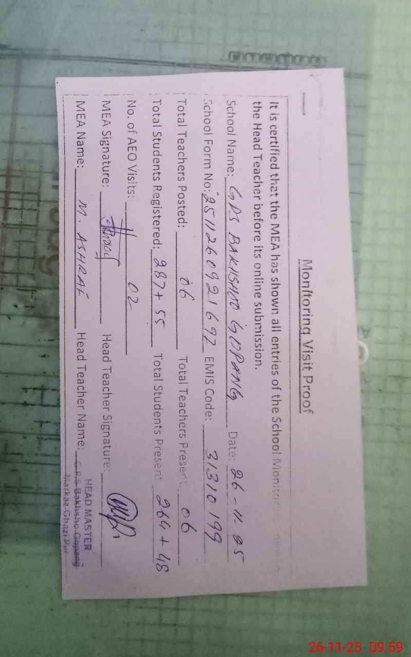 | EMIS Code: 31310199 | Name of School: GPS BAKHSHO GOPANG (After Noon) | |||