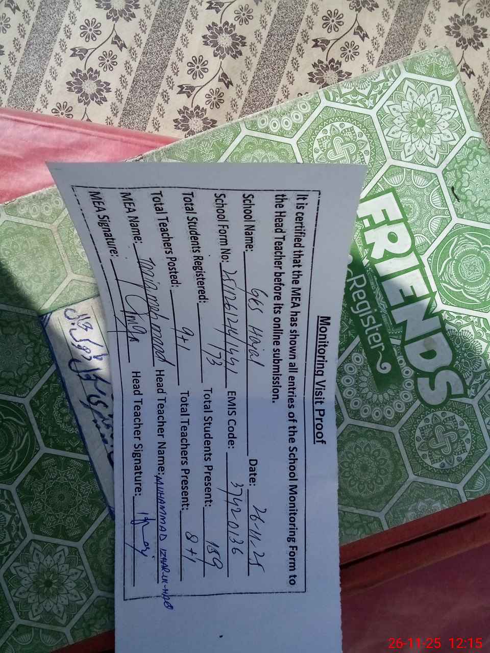 | Attendance Register | Head Teacher | MEA with School | Visit Proof |