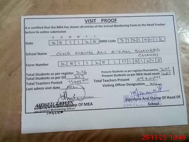 | EMIS Code: 37210016 | Name of School: GHS MEHR ALI AZAM SHAHEED (CHAKRI) | |||