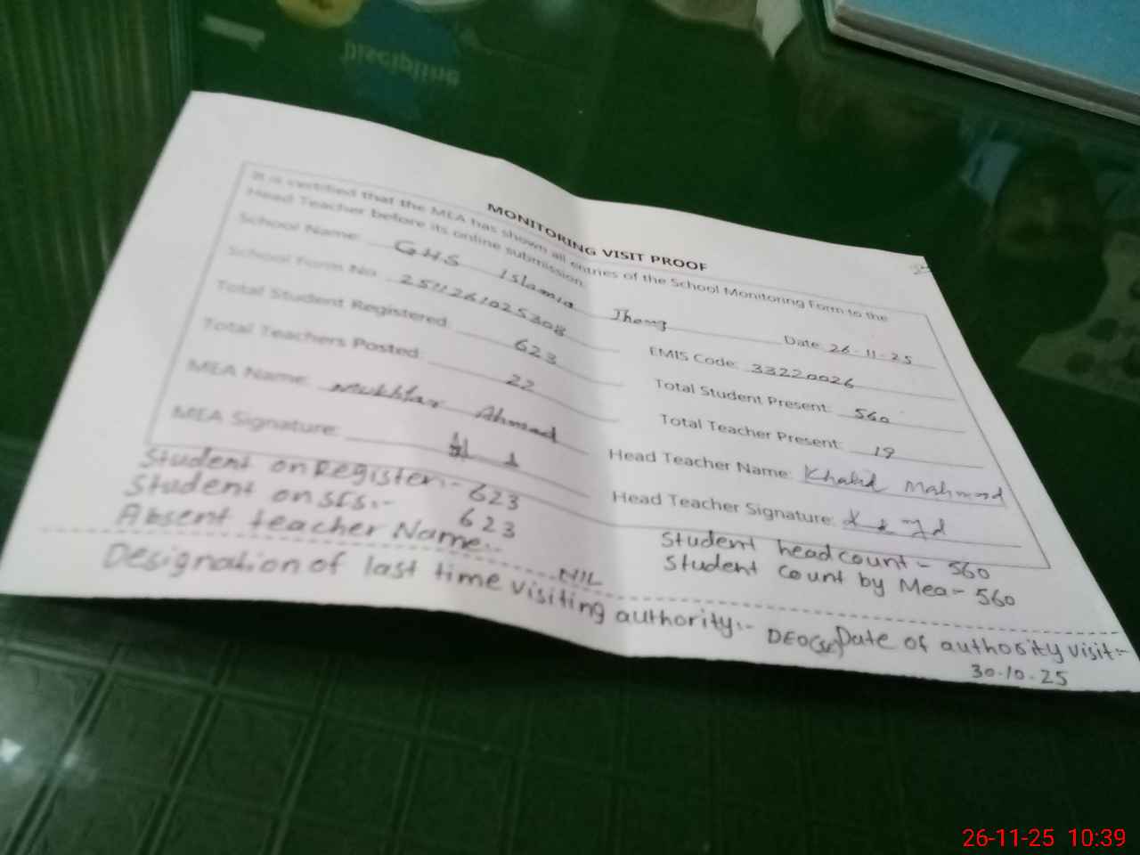 | Attendance Register | Head Teacher | MEA with School | Visit Proof |
