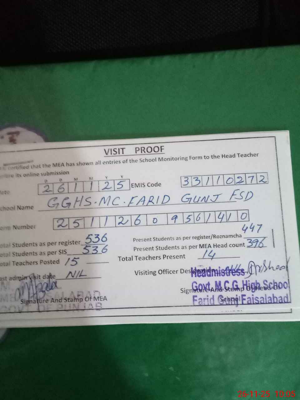 | Attendance Register | Head Teacher | MEA with School | Visit Proof |