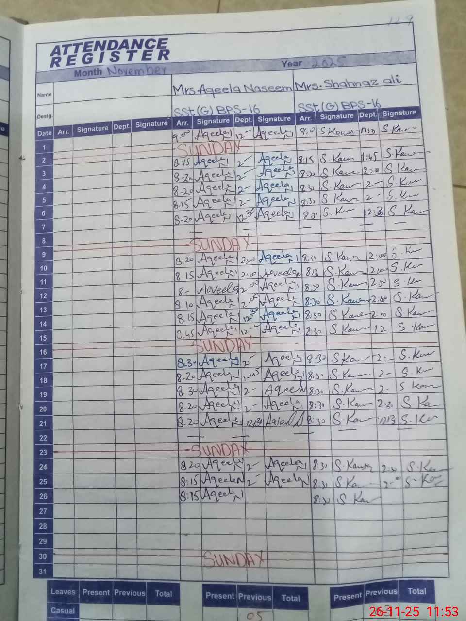 | CNIC | Full Name | Designation | R/C | Absence During Last Calender Month |