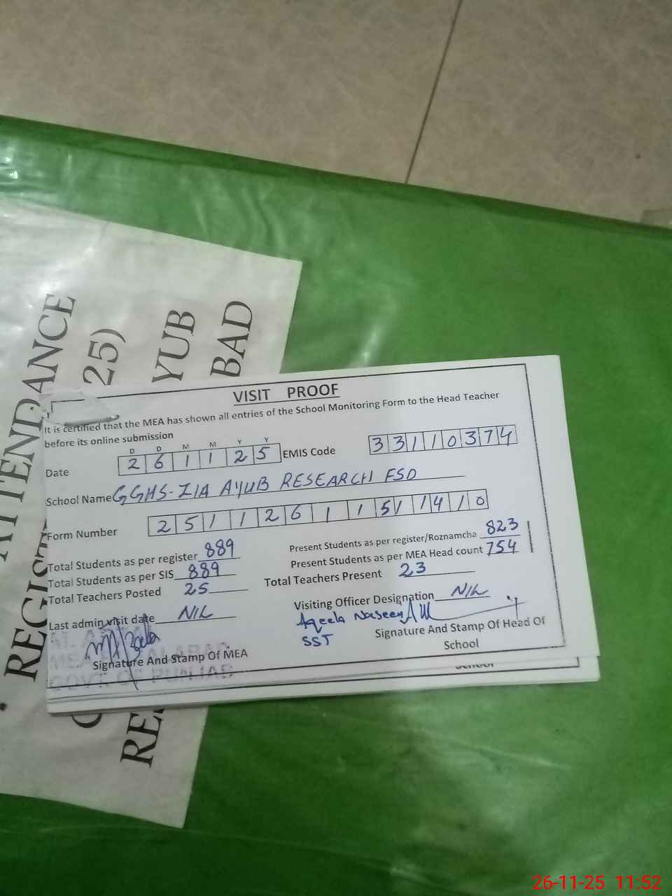 | Attendance Register | Head Teacher | MEA with School | Visit Proof |