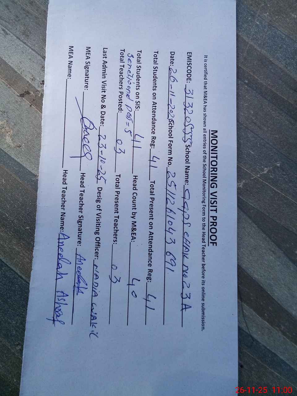 | Attendance Register | Head Teacher | MEA with School | Visit Proof |