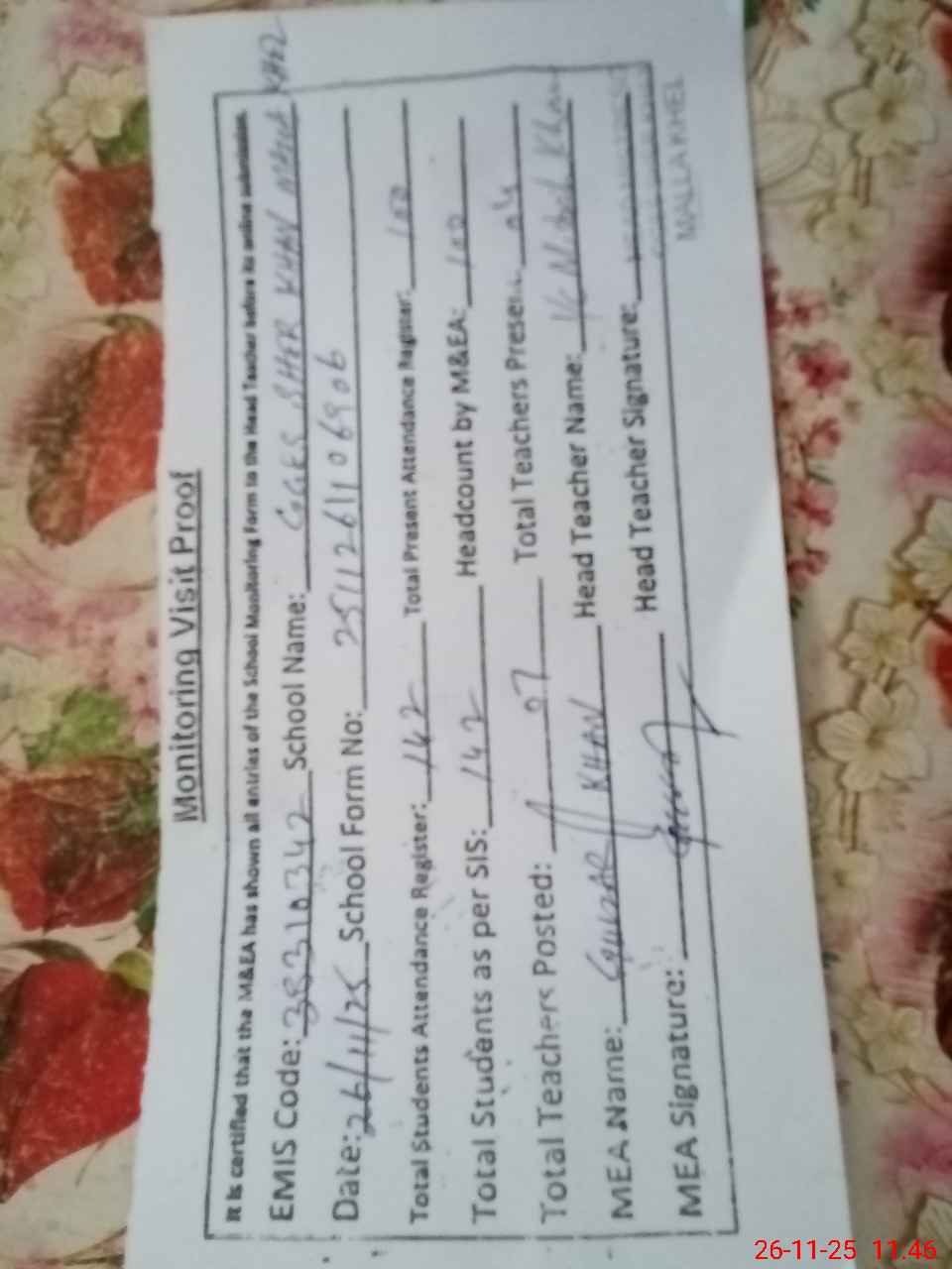 | Attendance Register | Head Teacher | MEA with School | Visit Proof |