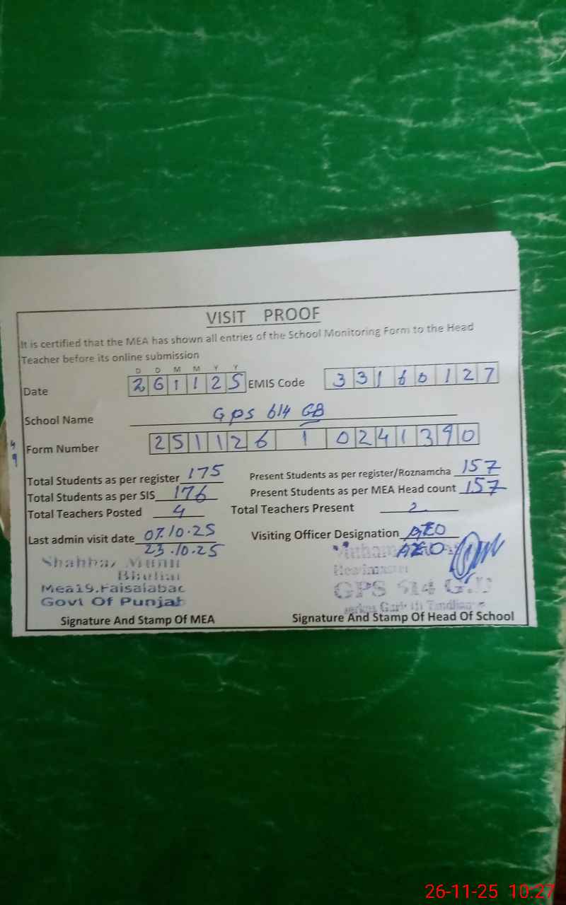 | EMIS Code: 33160127 | Name of School: GPS CHAK 614 GB TANDLIANWALA | |||