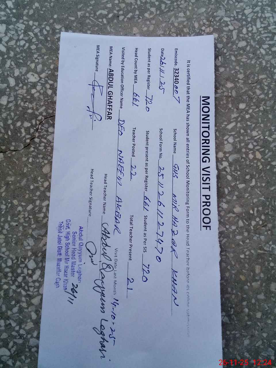 | Attendance Register | Head Teacher | MEA with School | Visit Proof |