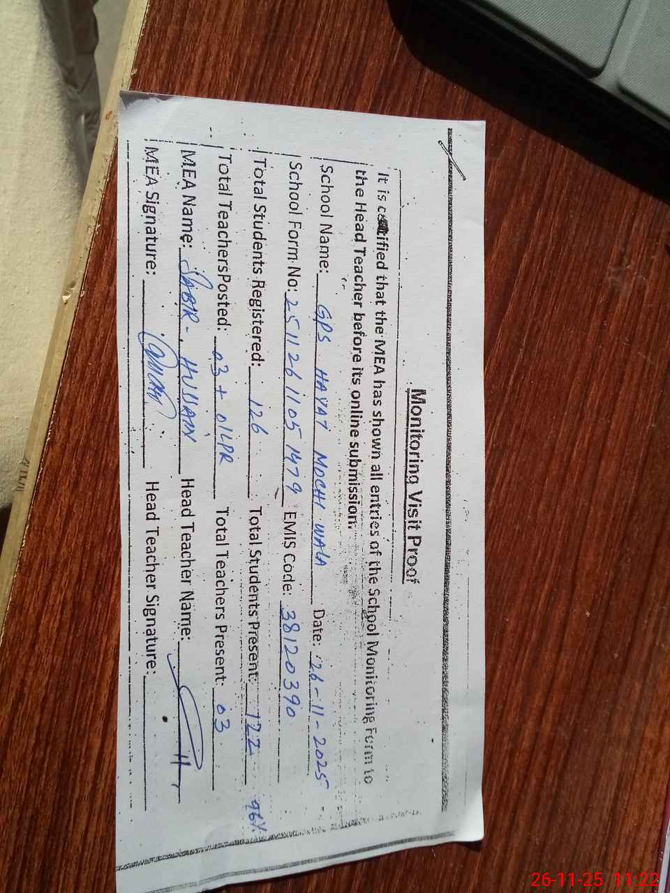 | EMIS Code: 38120390 | Name of School: GPS HAYAT MOCHI WALA | |||