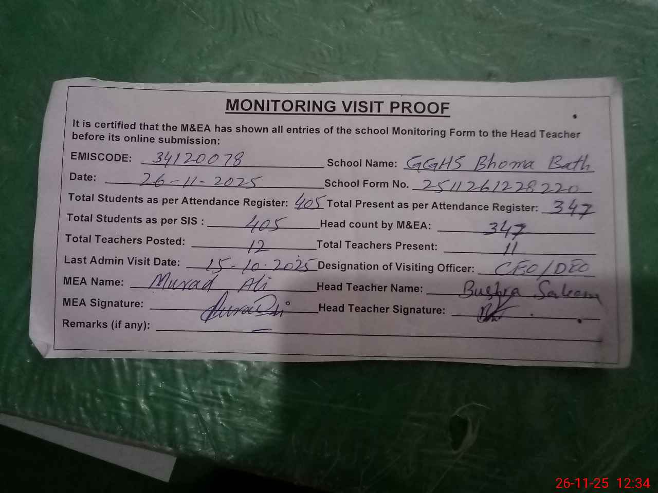 | Attendance Register | Head Teacher | MEA with School | Visit Proof |