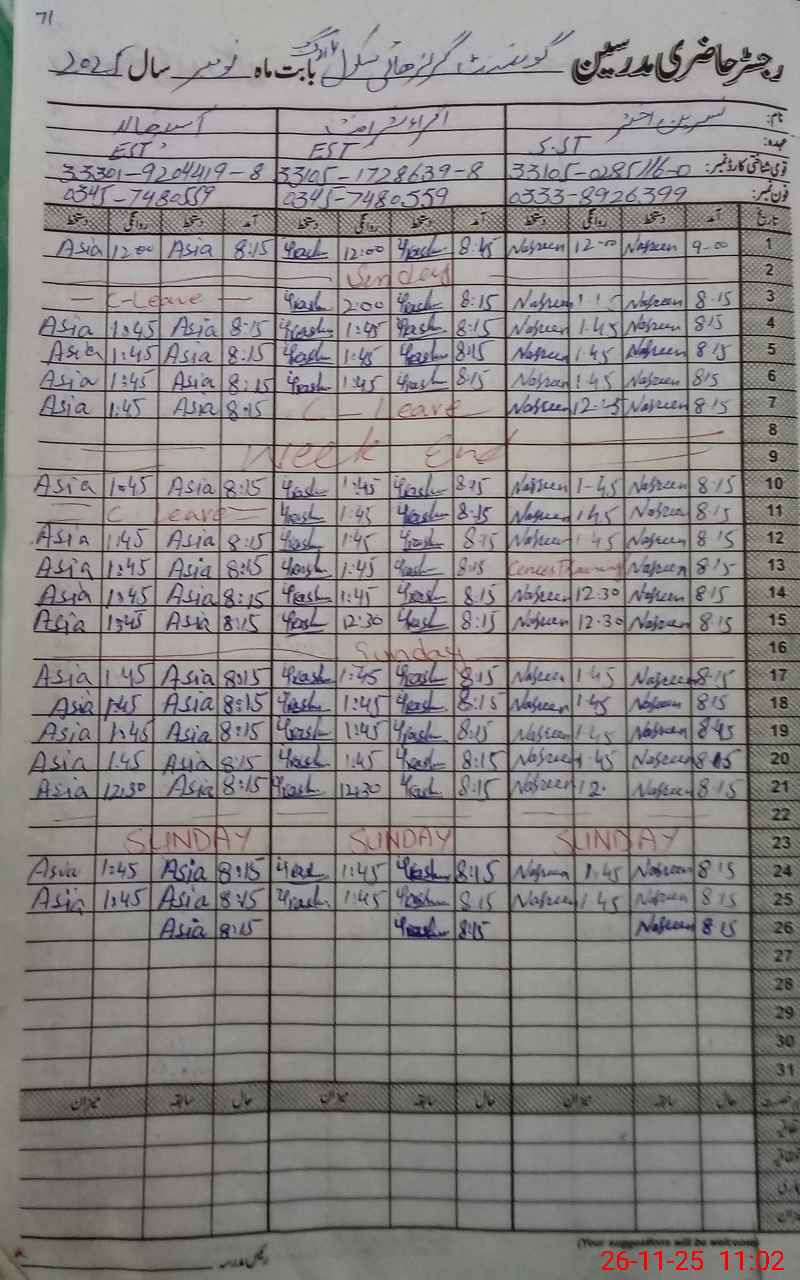 | CNIC | Full Name | Designation | R/C | Absence During Last Calender Month |