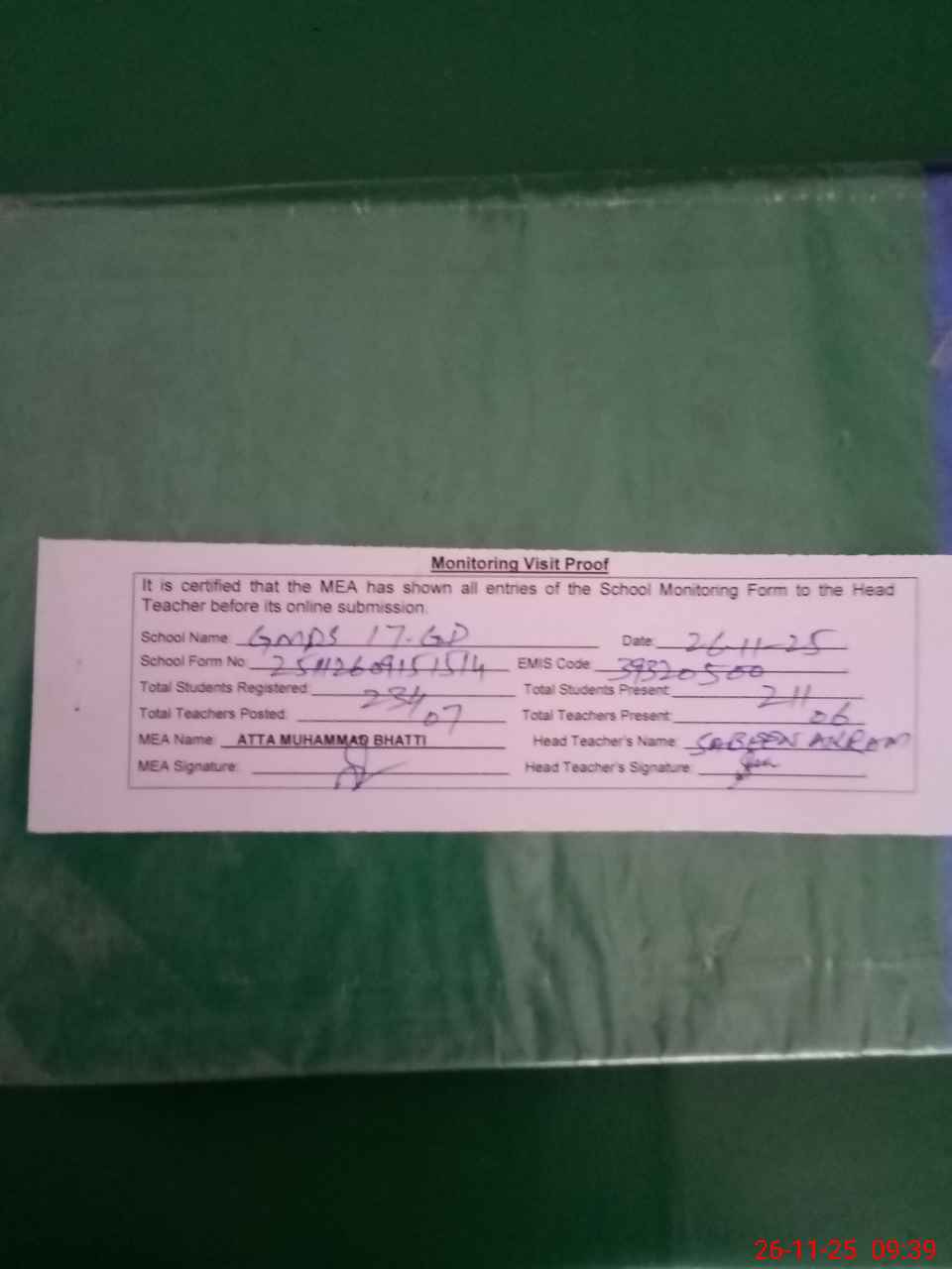| Attendance Register | Head Teacher | MEA with School | Visit Proof |