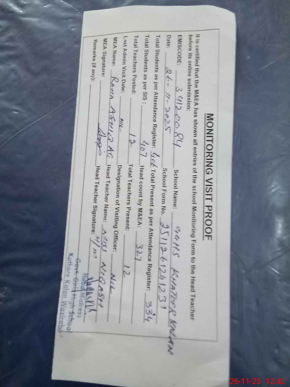 | EMIS Code: 34120084 | Name of School: GGHS KATHOR KALAN | |||