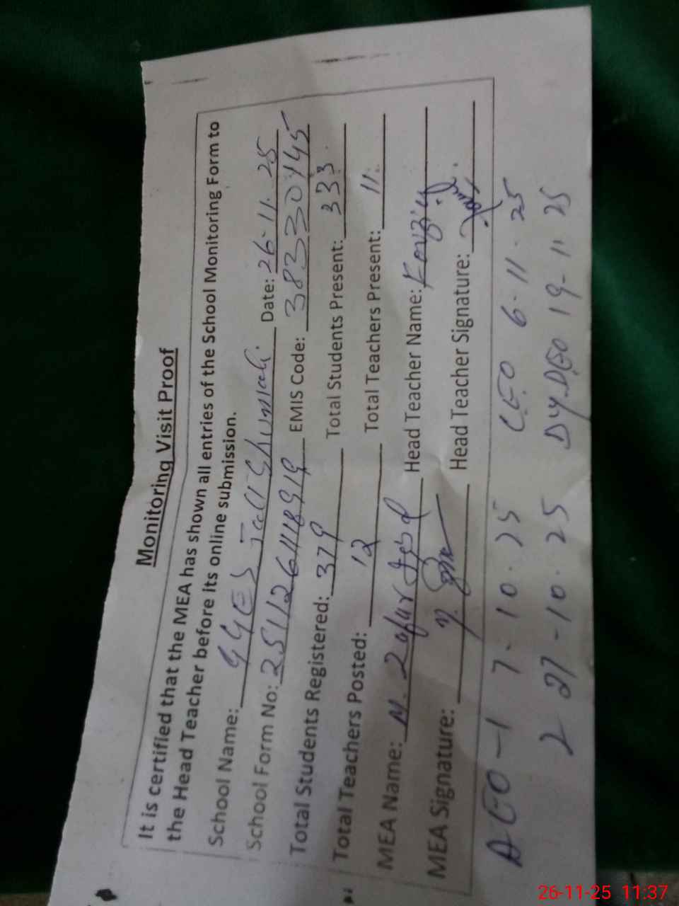 | Attendance Register | Head Teacher | MEA with School | Visit Proof |