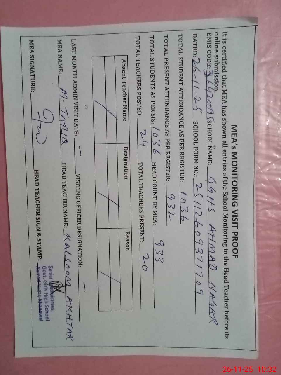| Attendance Register | Head Teacher | MEA with School | Visit Proof |