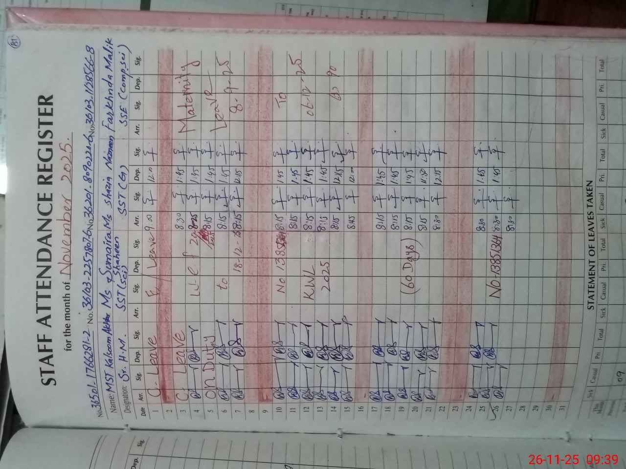 | Leave | Duty | Absent | Maternity | Medical | Ex- Pak |