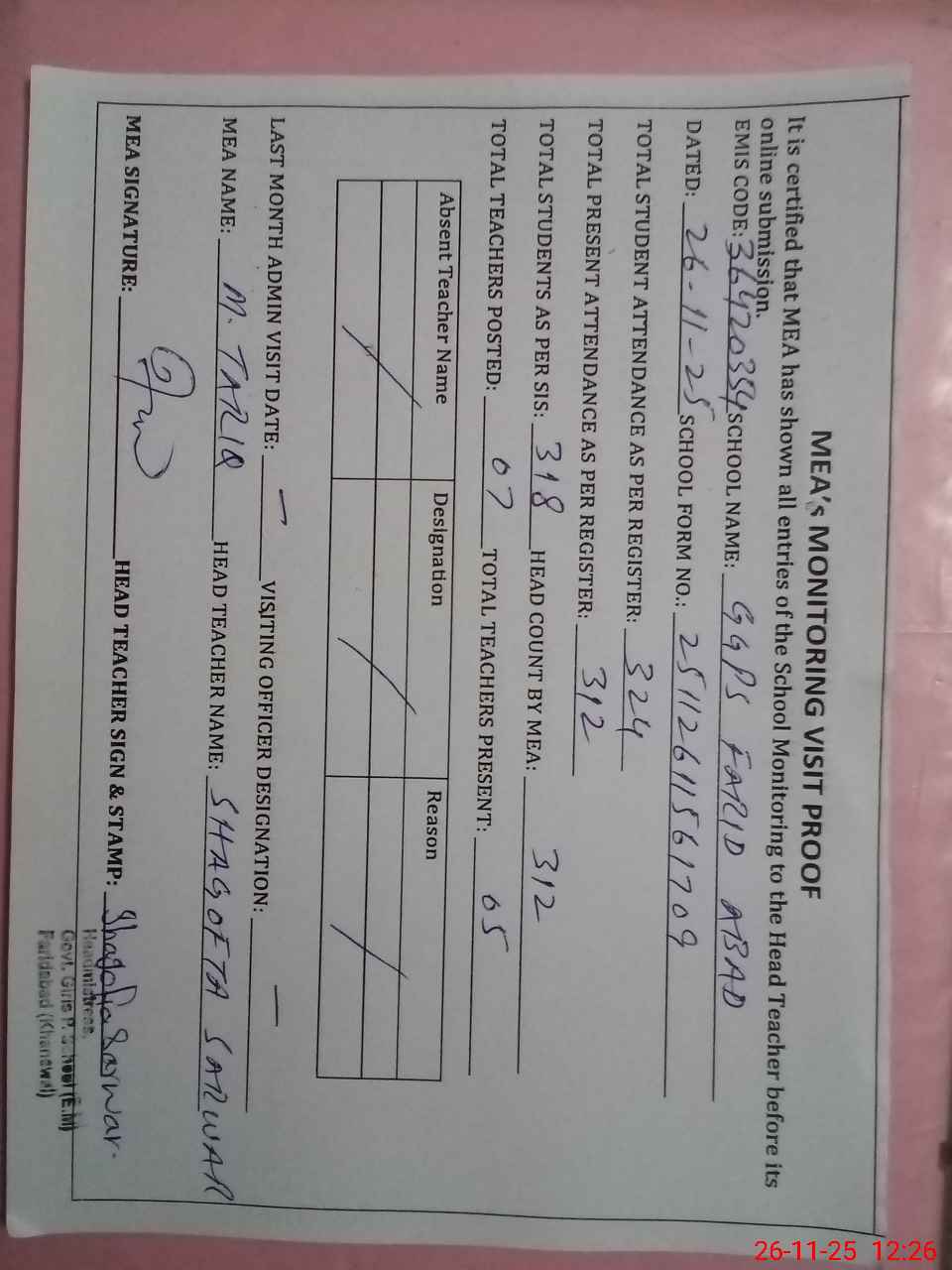 | Attendance Register | Head Teacher | MEA with School | Visit Proof |
