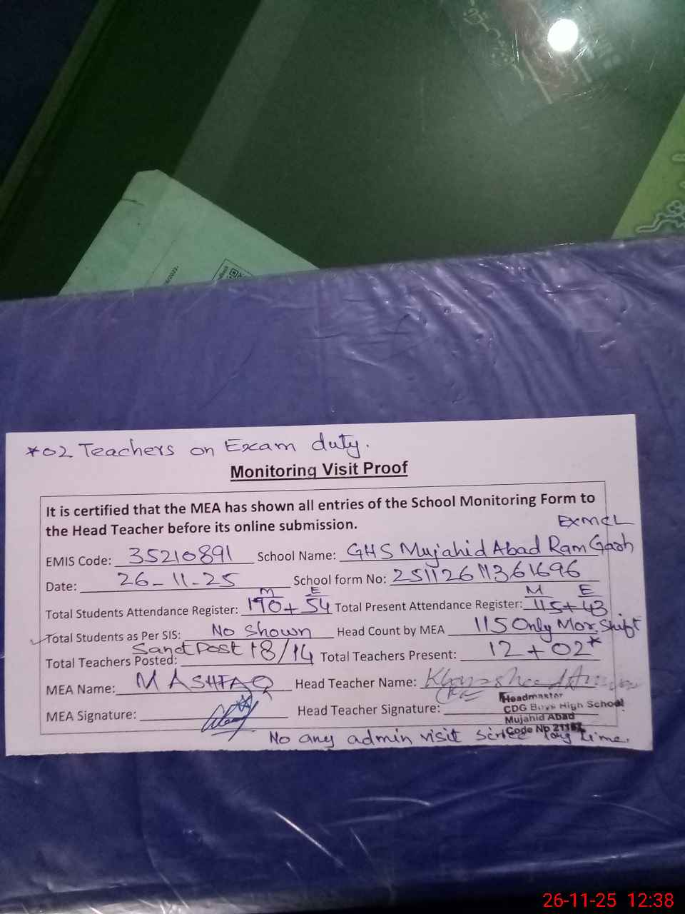 | Attendance Register | Head Teacher | MEA with School | Visit Proof |