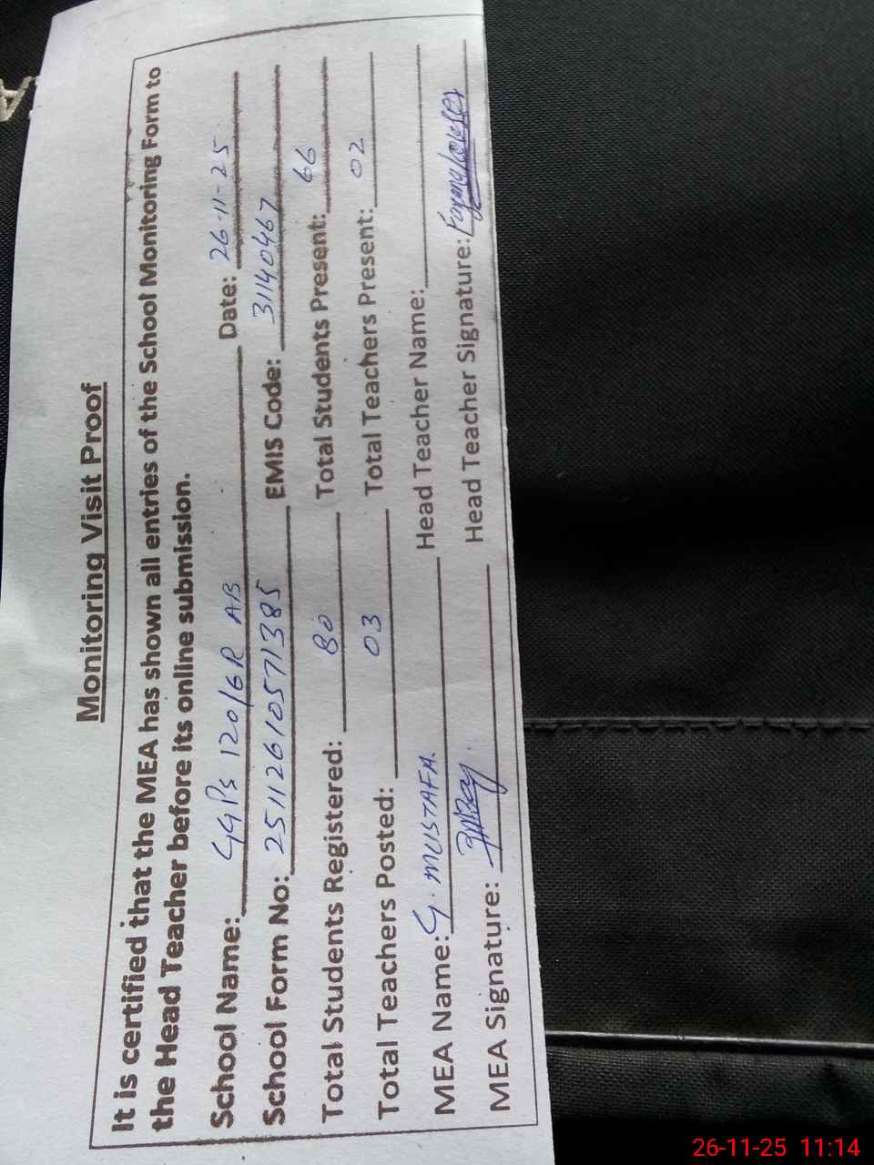 | Attendance Register | Head Teacher | MEA with School | Visit Proof |