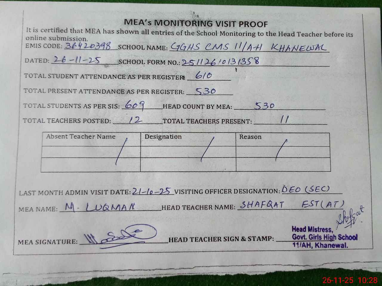 | EMIS Code: 36420398 | Name of School: GGHS CMS 11/AH KHANEWAL | |||