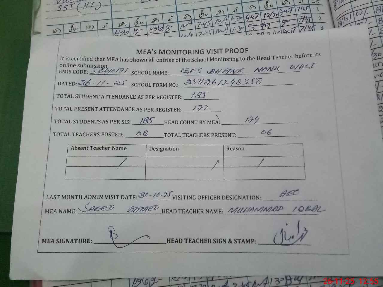 | Attendance Register | Head Teacher | MEA with School | Visit Proof |
