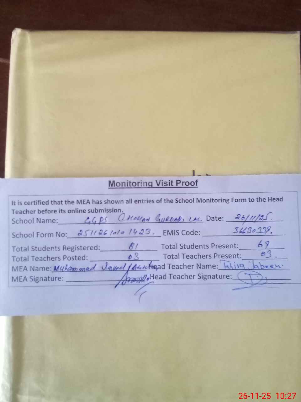 | Attendance Register | Head Teacher | MEA with School | Visit Proof |