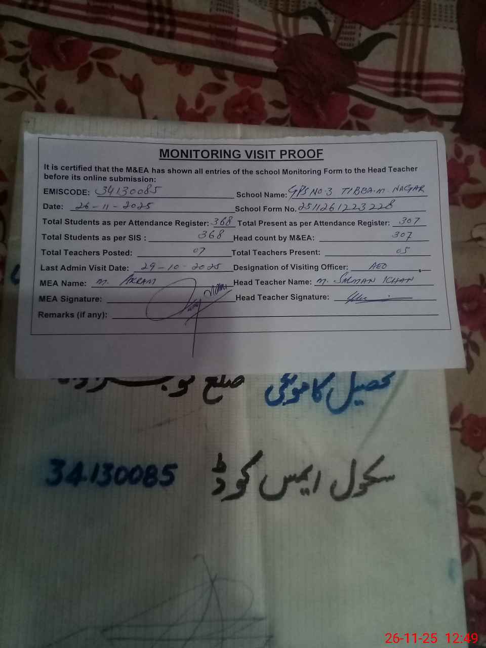 | Attendance Register | Head Teacher | MEA with School | Visit Proof |