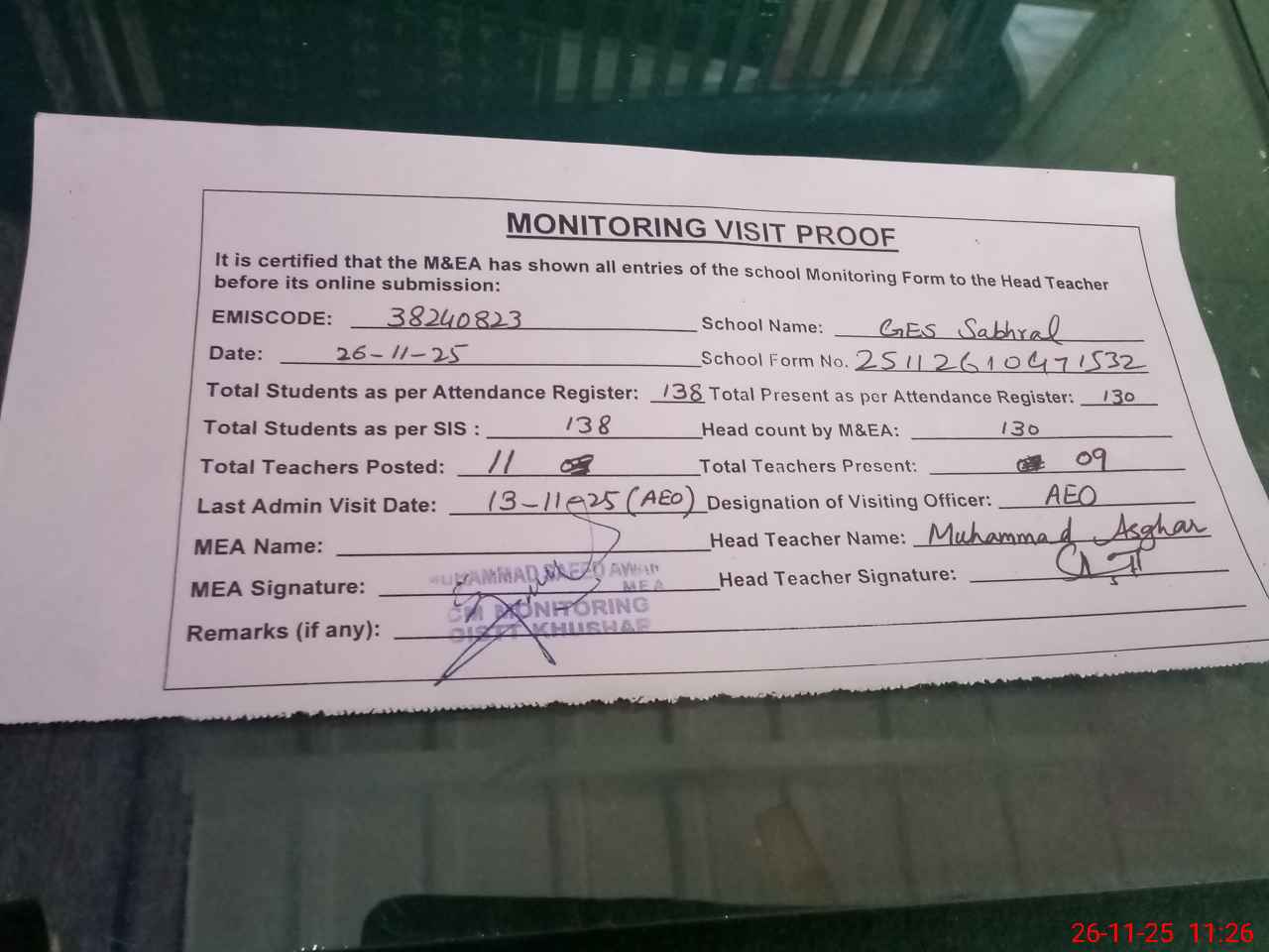 | Remarks (Use Separate Page if Required): Students on SIS QTY 138 Last admin visit On 13 November 2025 by AEO | |||||