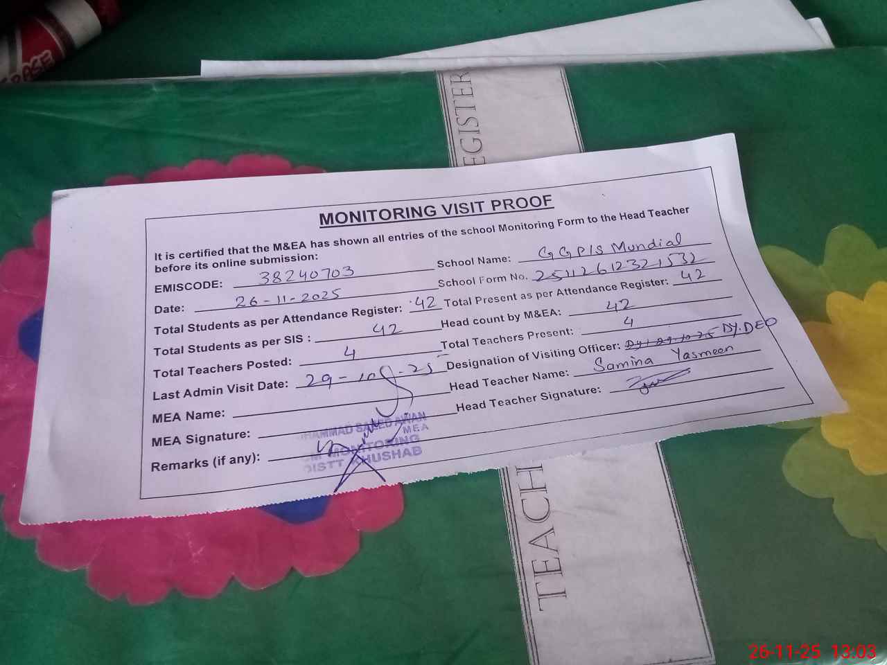 | Remarks (Use Separate Page if Required): Students on SIS QTY 42 Last admin visit On 29 October 2025 by Dy DEO | |||||