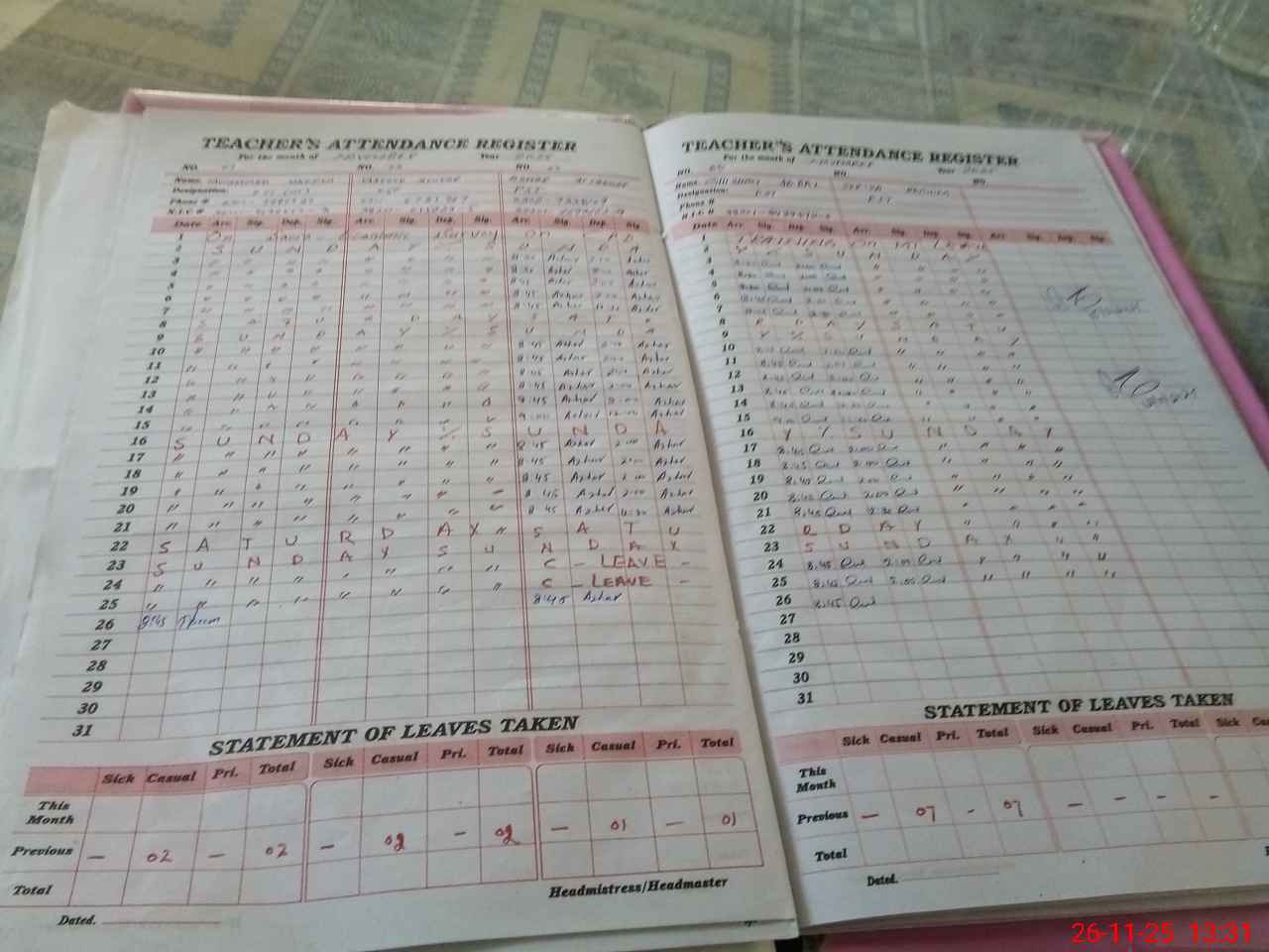 | CNIC | Full Name | Designation | R/C | Absence During Last Calender Month |