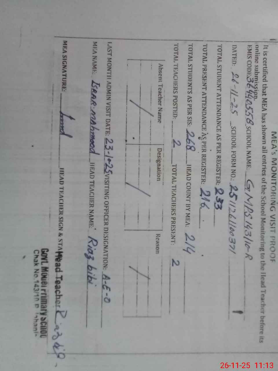 | Attendance Register | Head Teacher | MEA with School | Visit Proof |