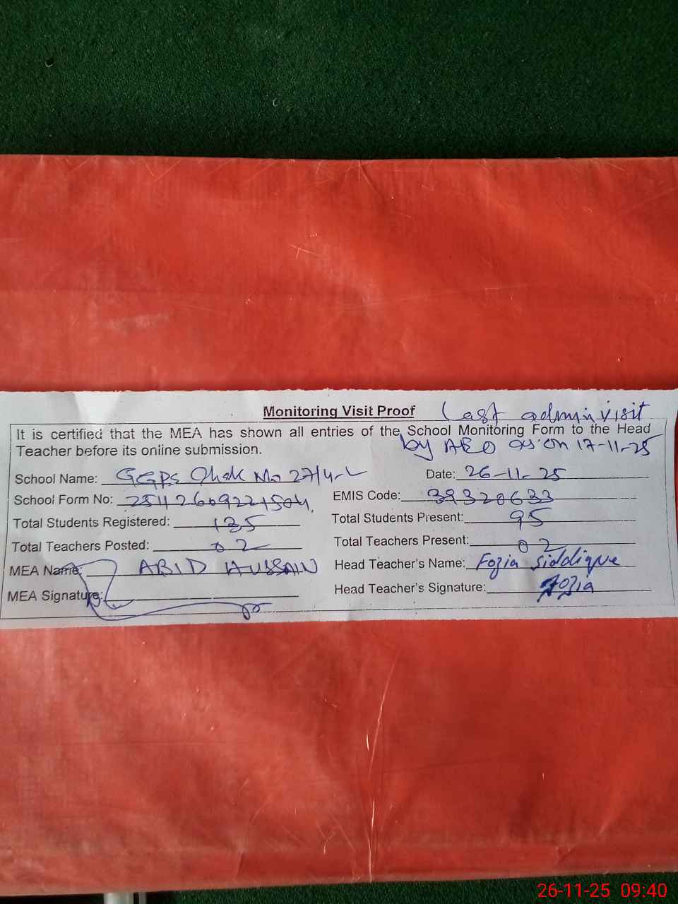 | Remarks (Use Separate Page if Required): Last Administrator visit by AEO as on 17-11-2025. | |||||
