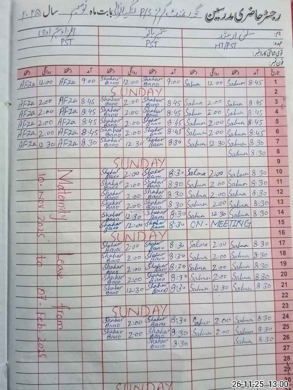 | 34**** | Af**** Sh**** | PST | Regular | 0 | 0 | 0 | 0 | 0 | 0 | 0 | 0 | 0 | Maternity |