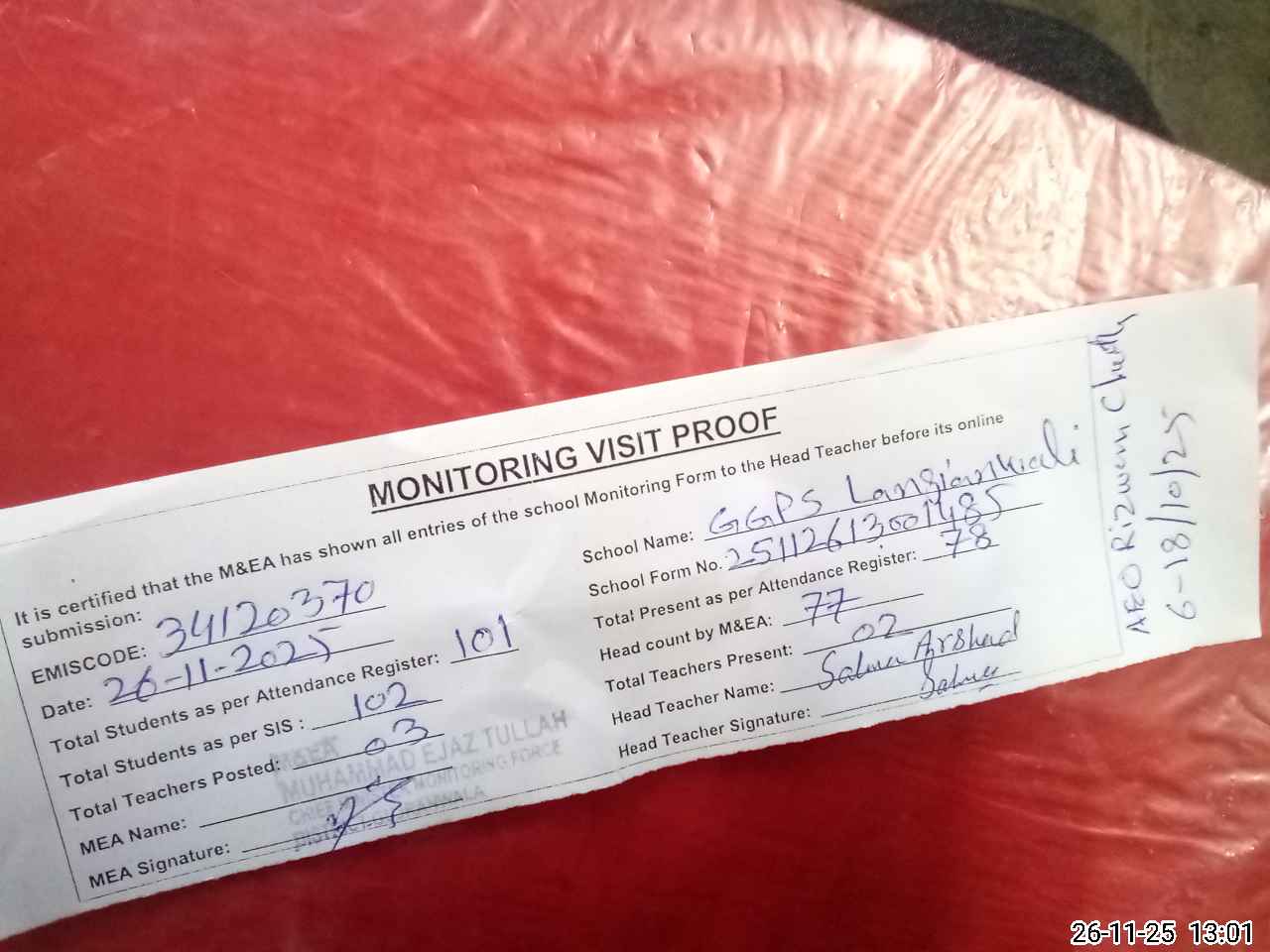 | Attendance Register | Head Teacher | MEA with School | Visit Proof |