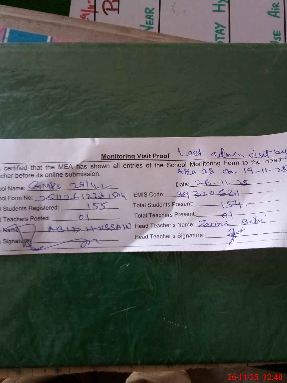 | Attendance Register | Head Teacher | MEA with School | Visit Proof |