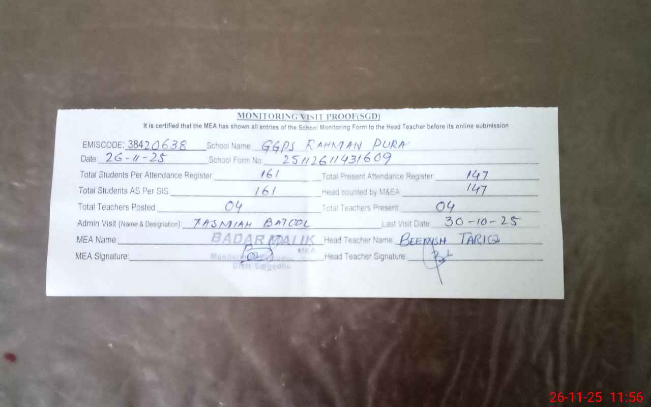 | EMIS Code: 38420638 | Name of School: GGPS RAHMAN PURA | |||