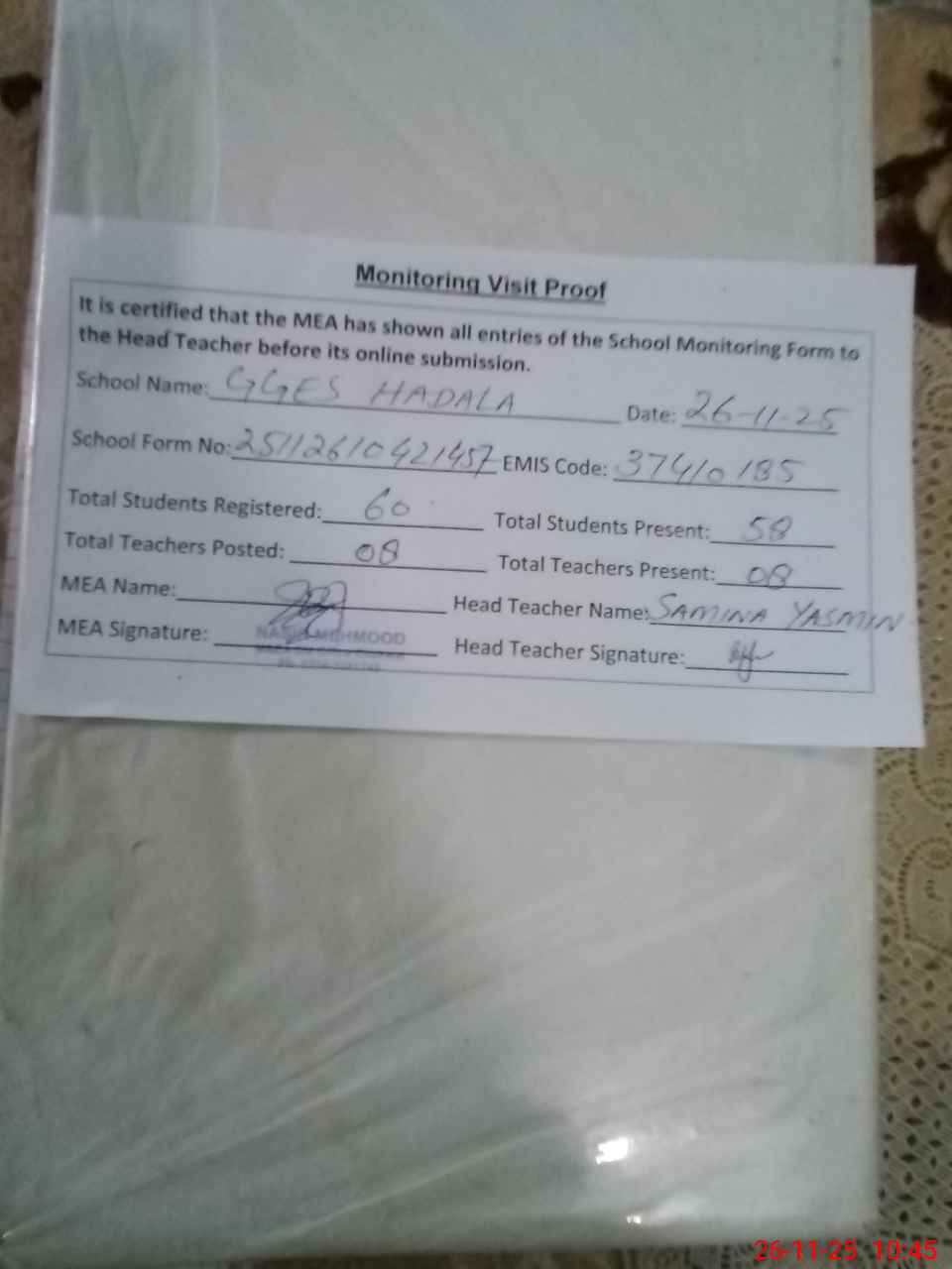 | Attendance Register | Head Teacher | MEA with School | Visit Proof |