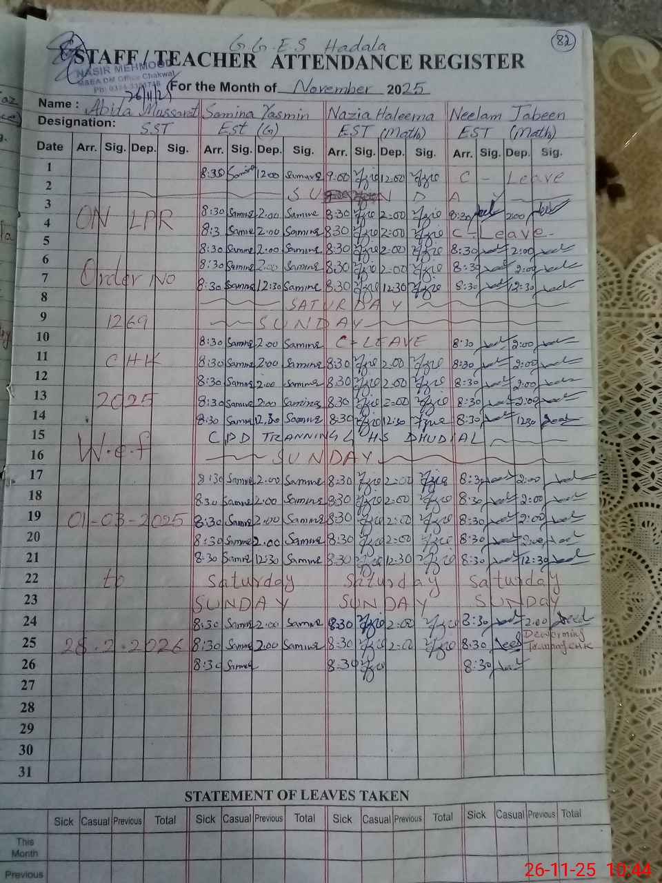 | Leave | Duty | Absent | Maternity | Medical | Ex- Pak |