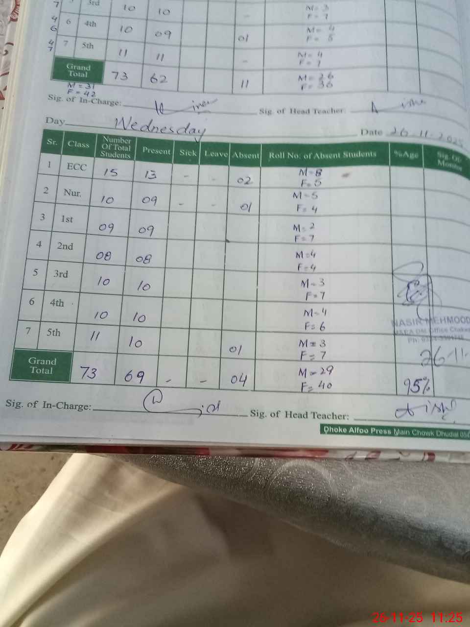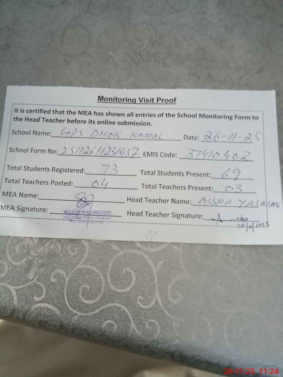 | Attendance Register | Head Teacher | MEA with School | Visit Proof |