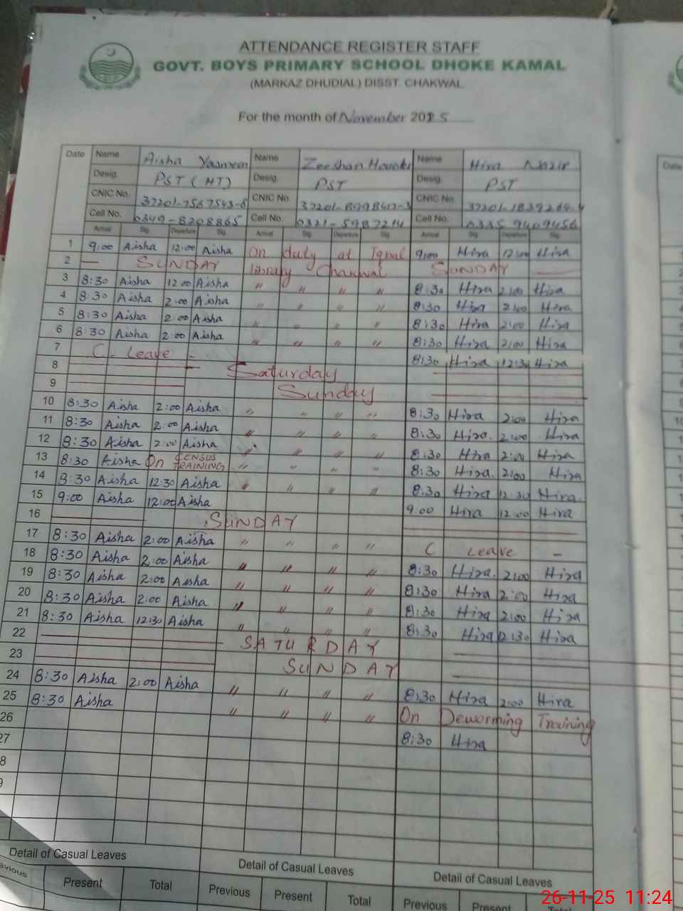 | CNIC | Full Name | Designation | R/C | Absence During Last Calender Month |