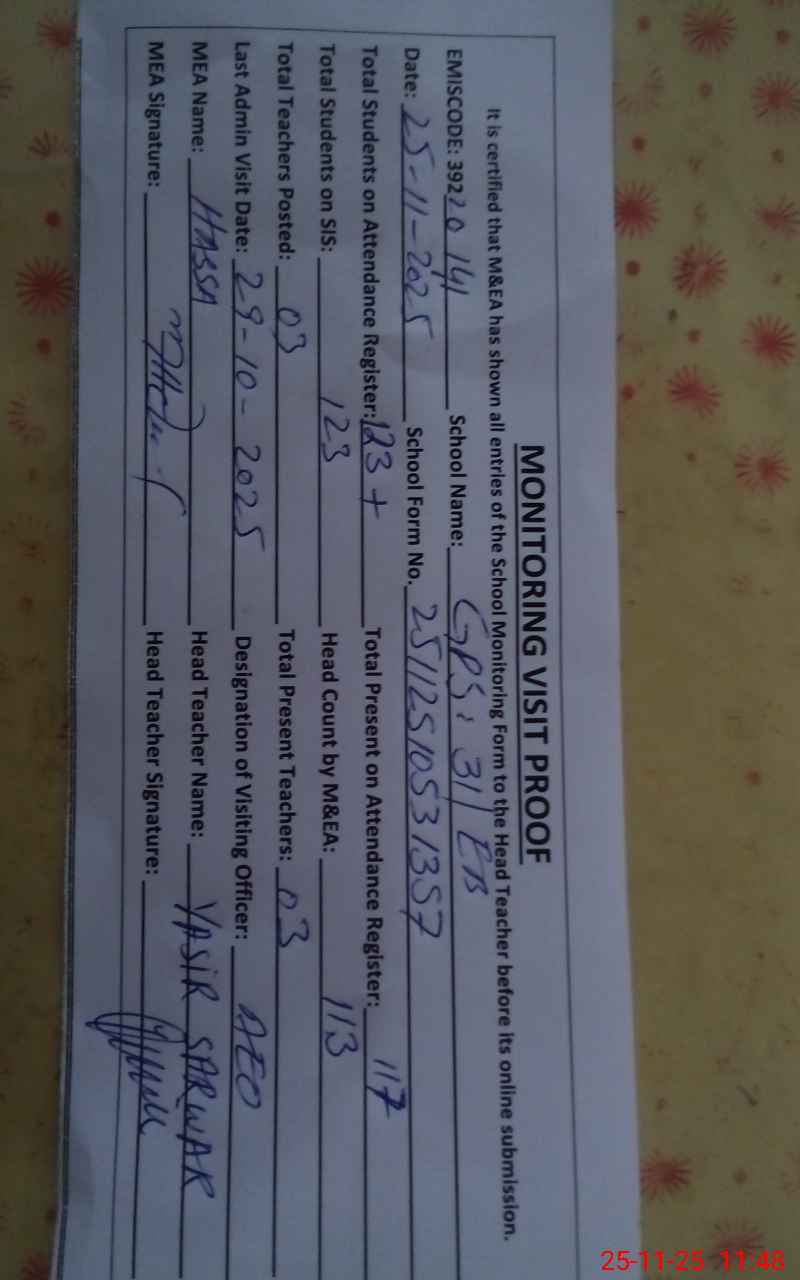 | EMIS Code: 39220141 | Name of School: GPS CHAK NO. 31 EB | |||