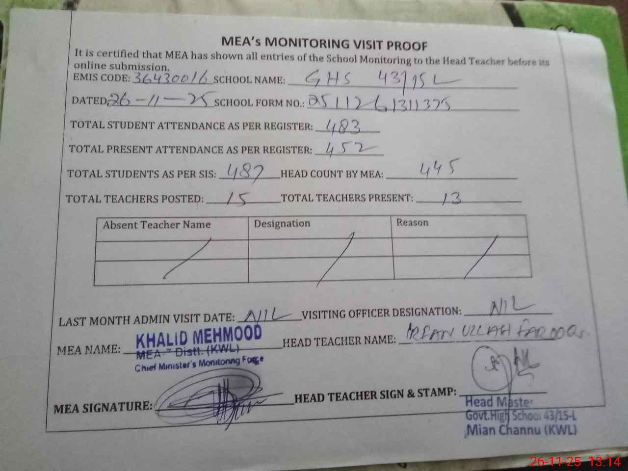 | EMIS Code: 36430016 | Name of School: GHS 43/15-L, MIAN CHANNU | |||