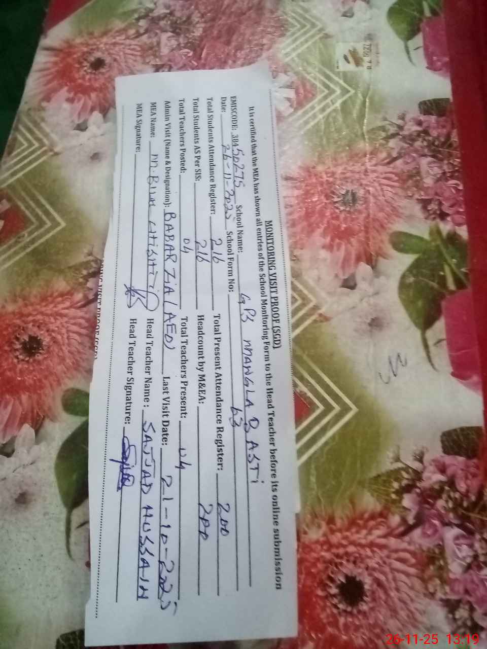 | Remarks (Use Separate Page if Required): Muhammad Zafarullah PST CNIC NO 3840294374551 expired on 28-09-2025 But is name still in the school | |||||
