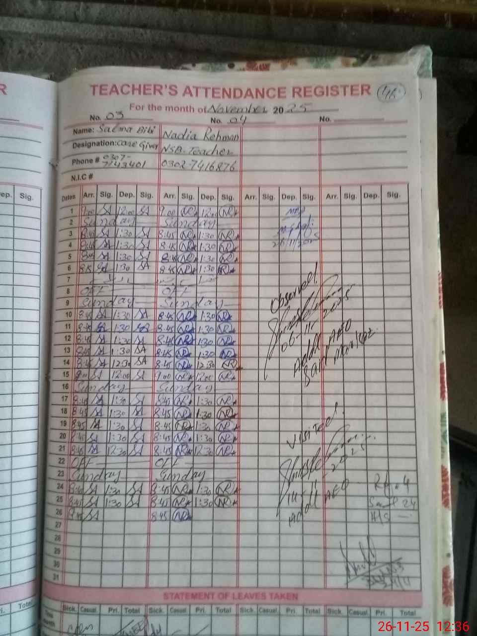 | CNIC | Full Name | Designation | R/C | Absence During Last Calender Month |