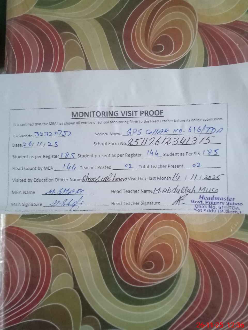| Attendance Register | Head Teacher | MEA with School | Visit Proof |