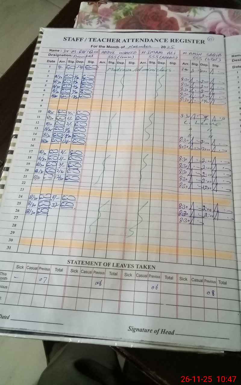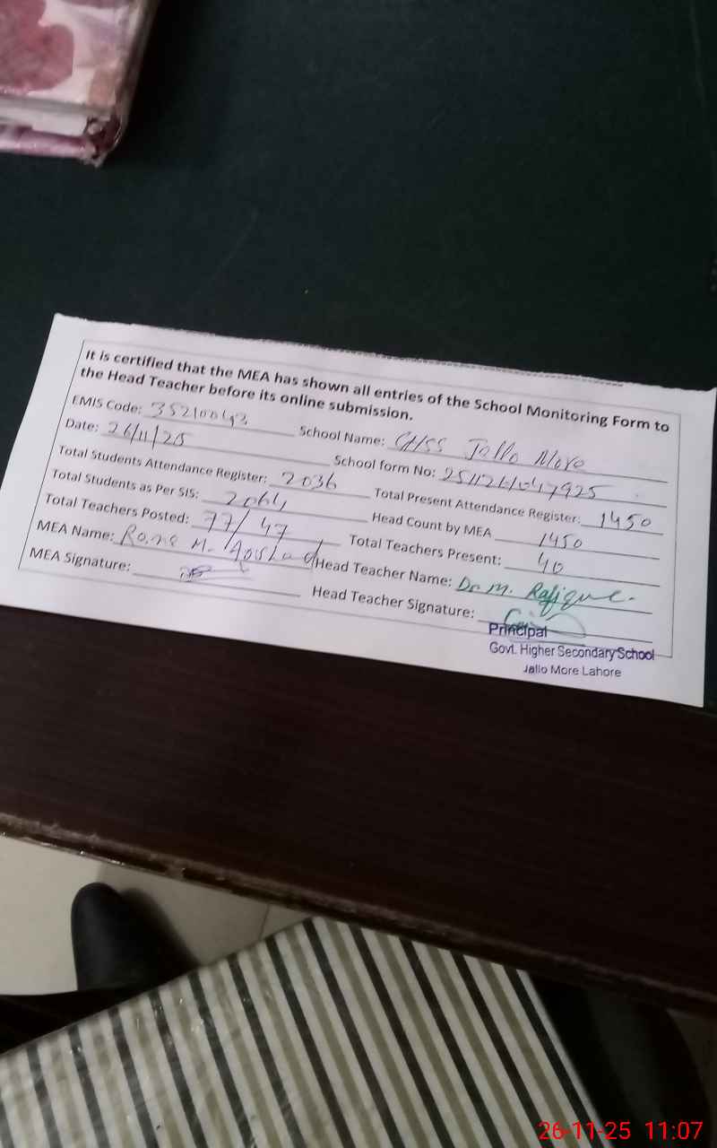 | Remarks (Use Separate Page if Required): special observation while I entered in school, I Saw different students busy for water carrier while I Head counting of 1st years and 2nd years Classes, management shuffling the students from one class to others classes MEA how count the students actually NBS record on SIS not maintain after July 2023 students attendance 71 percent | |||||