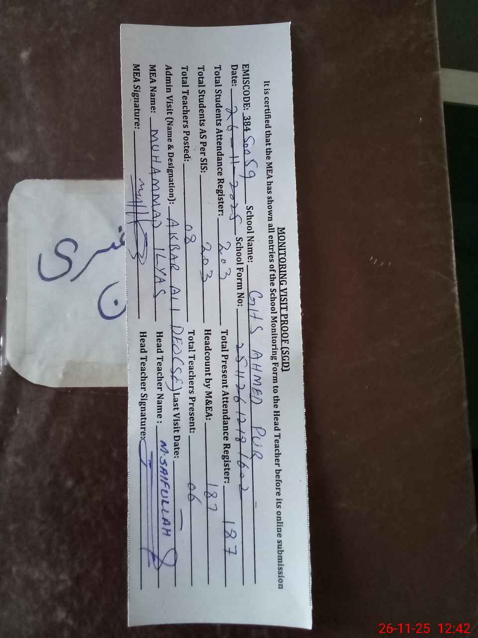 | Attendance Register | Head Teacher | MEA with School | Visit Proof |